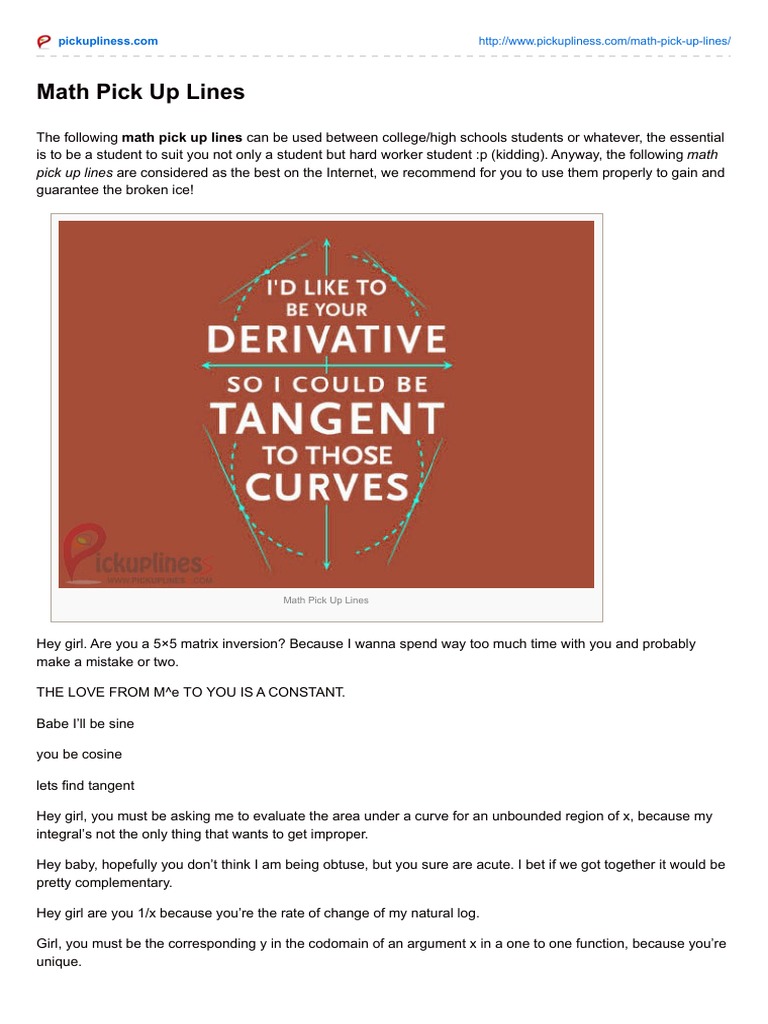 10 Best Math Pick Up Lines Images Pick Up Lines Math Pick Up Lines Pick Up Lines Cheesy. It's all in that magical combination of surprise, randomness, and cleverness mixed together. That can take a lot. Why don't you be the numerator and i be the denominator and both of us reduce to simplest form? Hi, i hear you're good i wish i was your calculus homework, because then i'd be hard and you'd be doing me on your desk. Check these 80 great pickup lines out and break the ice mathematically! Here are the lists of tagalog pick up lines and pinoy funny english pick up lines courtesy gmanews tv. We've found the best of them. Top 50 pick up lines tagalog. If you know that, and embrace it, funny pick up lines can really, actually but what makes pick up lines funny? Use it with care as it depends on the mood of a person if it will sound humorous or not. Funny math pick up lines. Using sweet math pickup lines, suggested in this post, can be of assistance in such cases. Using these witty, yet sweet math pickup lines can be of real help, and a sure way to arouse the interest of a person and generate some response, hopefully a positive funny math pickup lines to use on girls. If you wanna impress a math nerd, simple math equations like you plus me equals us will definitely not work well. Need some math pick up lines?