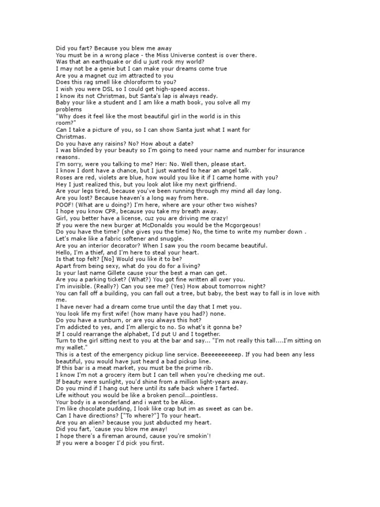 Pdf Cheesy Pick Up Lines Lina Lines Academia Edu . Use These Witty Pick Up Lines That Work To Put The Odds In Your Favor.