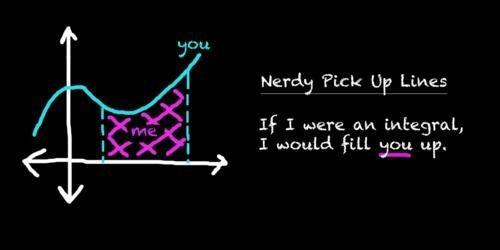 Nerd Love Nerd Love Nerdy Pick Up Lines Pick Up Lines. The best pickup line is not always the funniest or wittiest, or the one that your friend swears by. We've found the best of them. Cute math pickup lines to impress a math nerd. Need some math pick up lines? Math pick up lines are most creative to use and get your match easily. Most creative pick up lines for math fan to instant conversation with special 1. Funny calculus pick up lines. Whether you're a nerd or a geek, it's all the same! << we have over 150 categories of pick up lines on our main page! I wish i was your derivative so i could lie tangent to your curves.