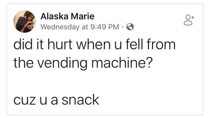 She Knew The Vending Machine Line So I Had To Improvise Tinder. So why have pickup lines survived, even though they make us cringe? Because whenever i look at you, everyone else disappears! << we have over 150 categories of pick up lines on our main page! From staring at you all day and i don't wanna look away. Whenever there is an epidemic or a global disease outbreak. 434 funny, cute, flattering and cheesy pick up lines. People are stuck in their apartments and have nothing to do so they turn up on dating are you a hot gla$$ of chicken noodle soup? My eyes hurt so much. Check out these other related articles! Following is our collection of smooth snacks chat up lines and openingszinnen working better than reddit. #1 best collection of pick up lines. Gurl, you remind me of a box of chocolates.(why?) if your left leg was breakfast and your right leg was lunch, i wouldn't be able to resist snacking between meals. Dating has never been easier. Summary of the best pick up lines from all categories. Because i'd love to drink you up!